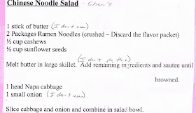 Making - Lots and lots of this salad. It's the whole reason we grow Napa cabbage. The printout is my cousin's original recipe, and all the notes were for Ryan when he asked for the recipe.
