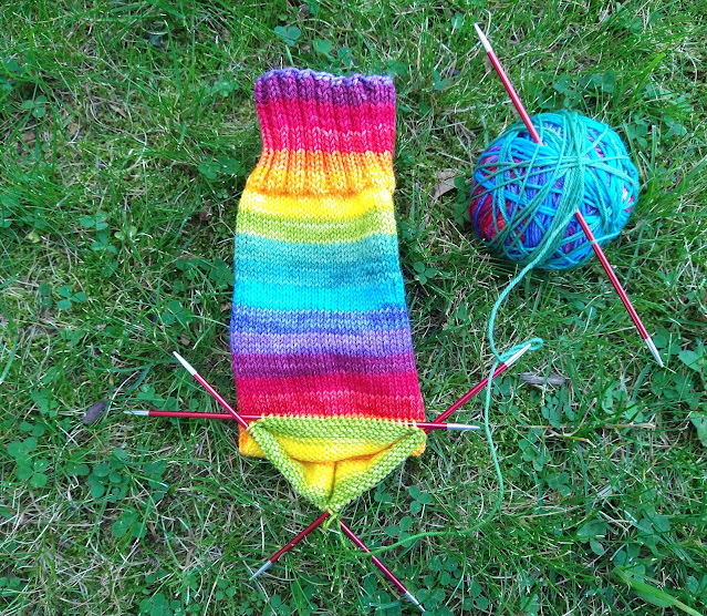 The blue and green striped one is ready for me to start on the toes, and the rainbow one is ready for the heel flap and turn if I can gather some gumption. Today it's supposed to reach 100 again, but motivation might be just around the corner tomorrow when the temperatures (hopefully) begin to drop.